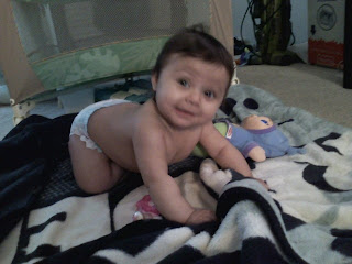 6 Months old – Crazy!!! I know this post is a little late, she turned 6 months old on the 14th Valentine’s Day 🙂 But I’m just now getting around to recording her stats and updating on her doctor’s appointment. She’s 17lbs 10oz. 26 inches long. New things she’s doing: She’s discovered her shadow. She started this past week saying Gagagaga. She’s still trying with all her might to crawl, but can’t quite figure it out yet. She basically falls on her face 🙁 Poor baby girl!!! During her 6 month doctor’s appointment her Dr. was talking about how pretty soon she’s going to develop separation anxiety and blah blah blah well, in the middle of him explaining this all to me she’s watching his every move. Then out of the middle of nowhere she screamed her head off. Ever since that moment Ella has separation anxiety and screams every time I walk out of the room. She loves Jayden. She get so excited when he walks in the room and whenever he actually pays a little attention to her, her face lights up. She still hasn’t gotten any more teeth, but she has the 2 on the bottom. And when she bites they hurt! She loves other babies and gets all excited when she sees them. Already my social little butterfly. She discovered splashing the other day in the bathtub and I’m putting a video of that on here. I know that almost every picture of her she has no clothes on, but I promise you she has plenty of clothes….she just loves to be naked w/a diaper on. With how much this girls spits up I love her to be just in a diaper too.
